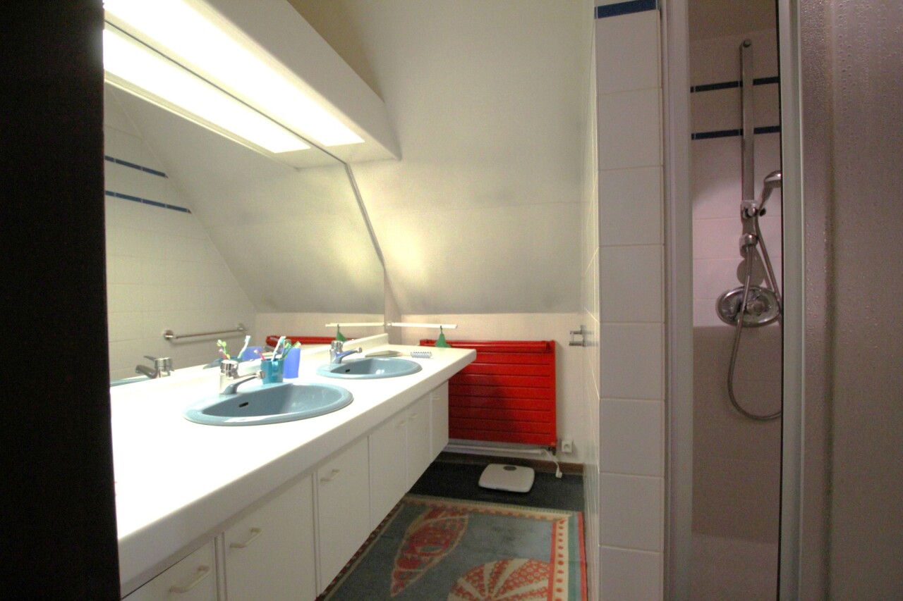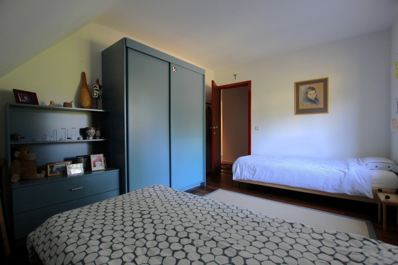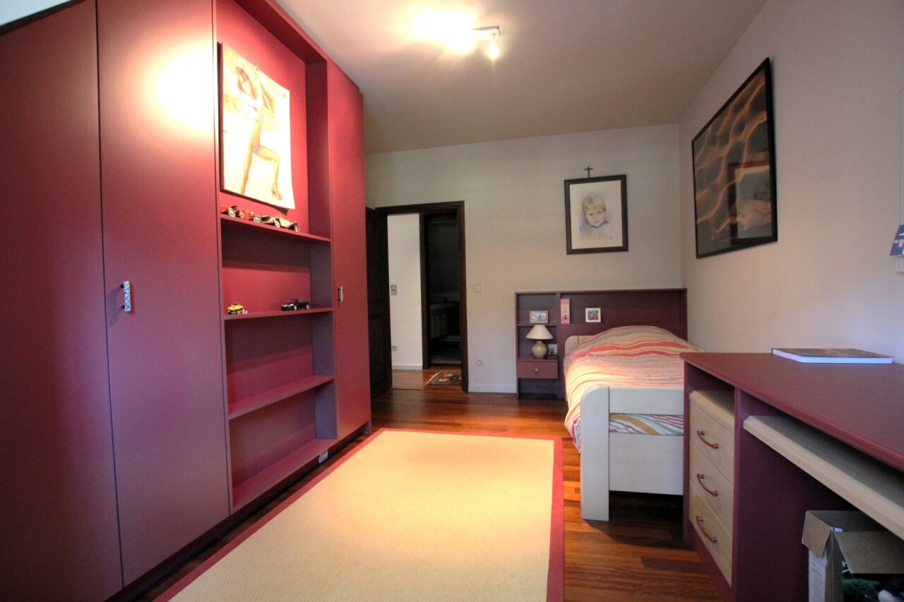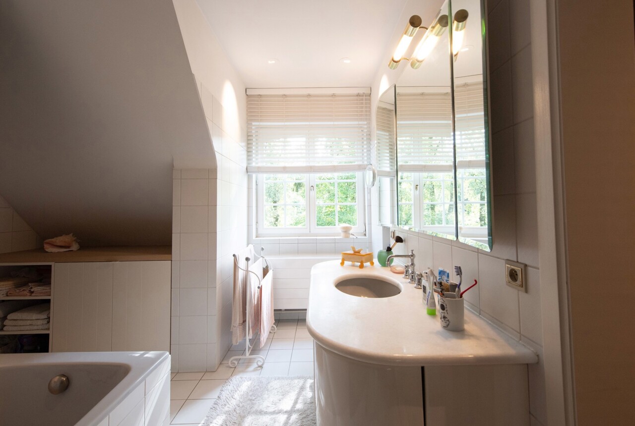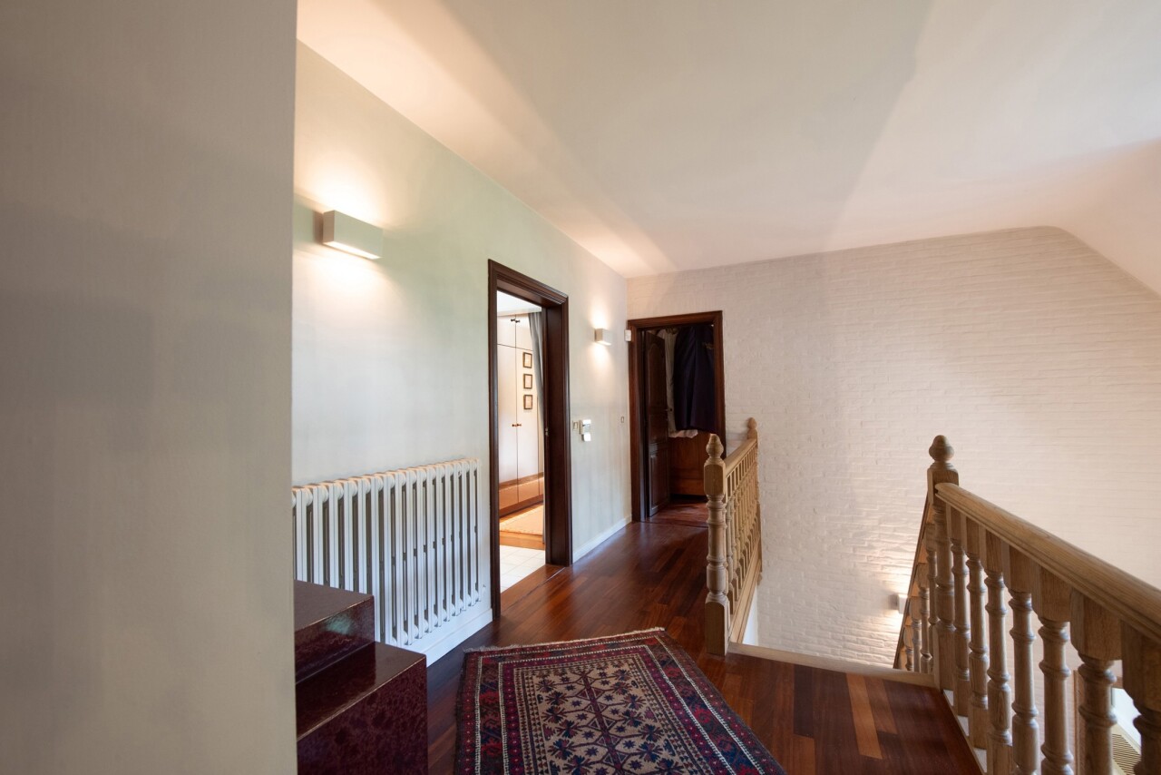 Op de bovenverdieping bevindt zich een ruime hoofdslaapkamer (28 m²) met dressing en ensuite badkamer. Verder drie kinderkamers van resp. ca. 13, 12 en 11,5 m² met eigen badkamer (dubbele lavabo en douche), nachttoilet op de gang en een hobbyruimte of speelkamer of kantoor van ca. 30 m² bereikbaar vanuit de garage. Een vlizotrap geeft tot slot toegang tot een ruime bergzolder. Deze villa gelegen is in de groene omgeving van de Trappistenabdij en het Molenbos, waar men schitterende wandelingen kan maken. Tevens is er een bushalte naar Antwerpen of Turnhout op 500 m wandelafstand. Het dorp van Westmalle met het Sint-Jan Berchmanscollege en en Mariagaarde bevindt zich op een tweetal km oftwel 7 fietsminuten. Asbestveilig. E-label C.
