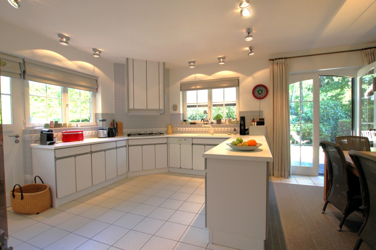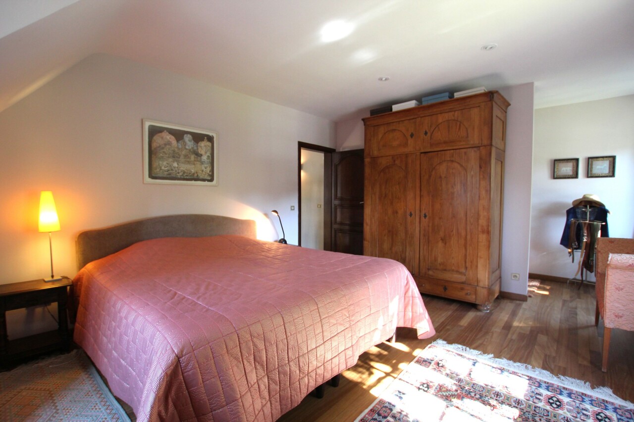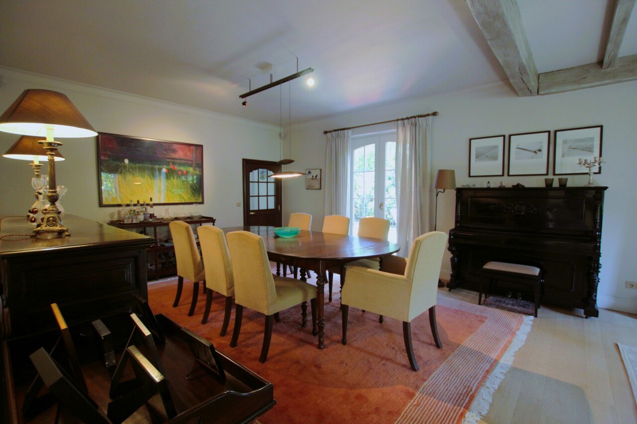 Op een uniek perceel van 4541 m² en 33 meter breed treffen we deze prachtige villa gebouwd in 1985 en voorzien van een vernieuwde CV-ketel en dubbel geïsoleerd pannendak (zowel het dak als de vloerplaat zijn recent geïsoleerd met glaswol en de vloer van de zolder is afgewerkt met triplex platen), overal houten ramen met dubbel glas en dus een gunstig C-label. De woning is onderkelderd met een verluchte ruimte van 1.85 m en beschikt daarnaast over een wijnkelder. Via de riante inkomhal met lichteiken trap en vestiare met gastentoilet, betreden we de leefruimte (57 m²) in L-vorm met antieke schouwmantel in Franse zandsteen en volledig voorzien van voleiken parket (20 mm). Vanuit de eetkamer bereiken we de ruime leefkeuken (30 m²) met naastgelegen bijkeuken (18,6 m²) met doucheruimte die verder toegang geeft tot de dubbele garage. De keuken is ingericht met alle toestellen en beschikt ook over een gezellig houtkacheltje. Tevens ga je vanuit de keuken naar het oostgericht terras met zicht op de diepe tuin of het zuidgerichte en gedeeltelijk overdekte terras gelegen langs de rechterzijkant van de woning.
